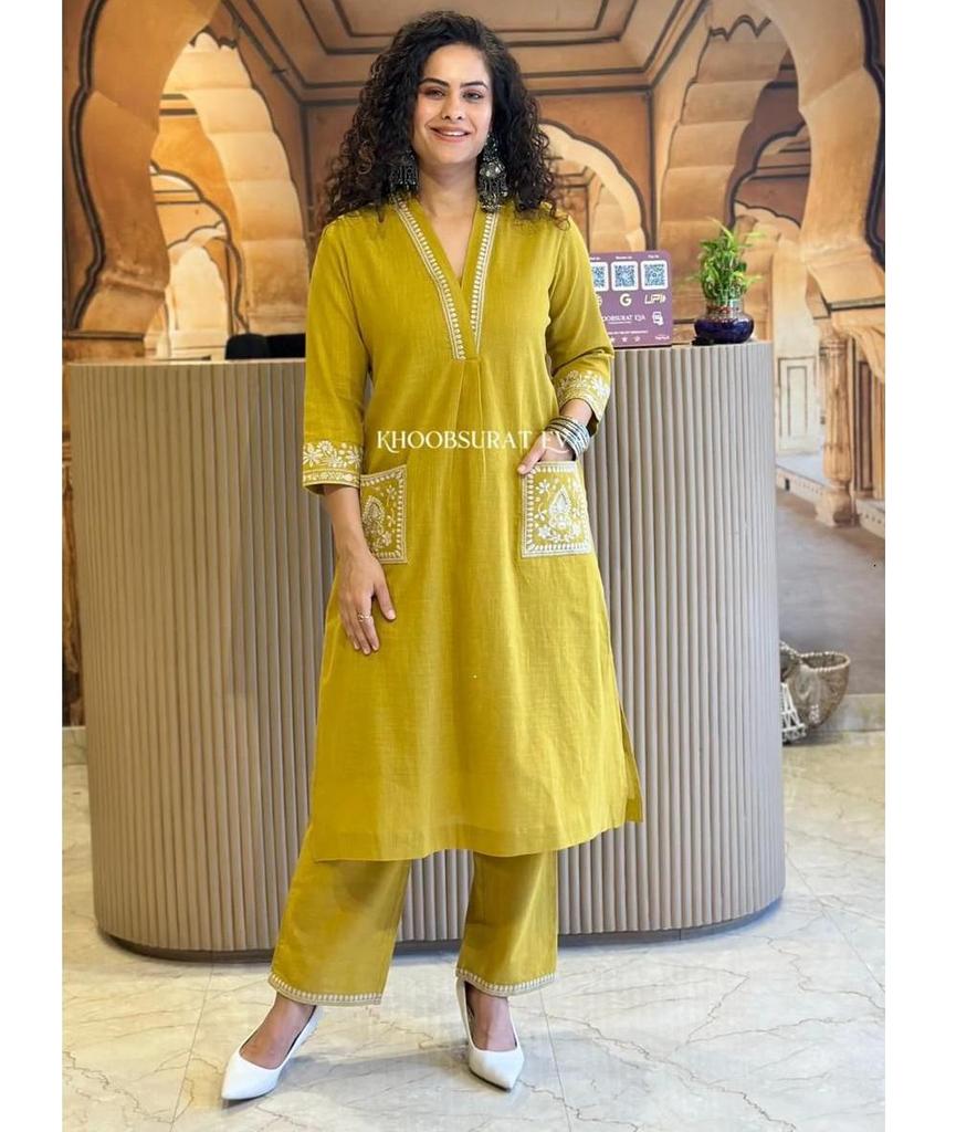 Women Designer Heavy Cotton Kurta Pant Set Embroidered Party Wear Top Tunic Kurti Dress