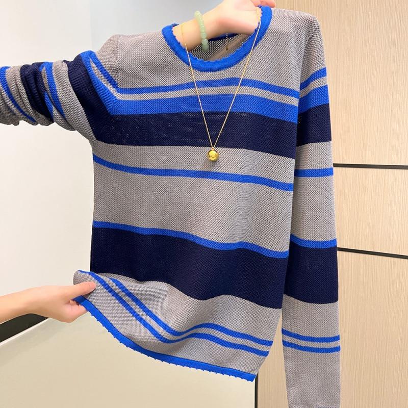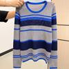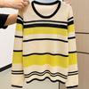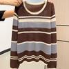 Jesienno-zimowy sweter dzianinowy z kontrastowymi paskami i ażurowym wzorem, z długim rękawem, damski sweter bazowy
