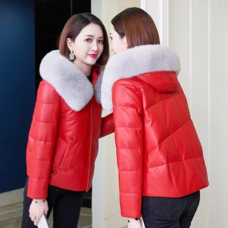Leather jacket women's short new down cotton-padded jacket imitation fox fur collar hooded with cotton fur cotton-padded jacket