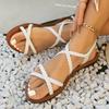 Moda 2025 Lato Rzym Damskie Sandały Okrągły Nosek Gumka Płaskie z Wąskim Paskiem Plecione Sandały Outdoor Duży Rozmiar Casual Buty na Plażę