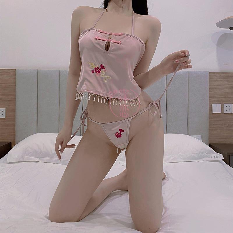 Sexy belly pocket pearl embroidered lace-up panties set classical hollow erotic underwear open-file uniform