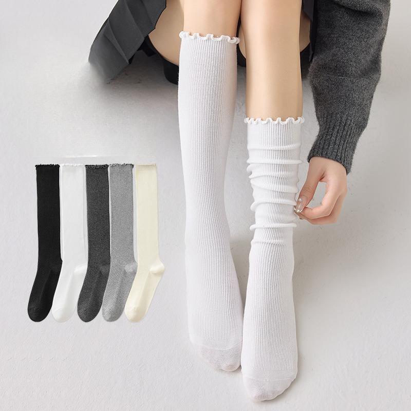 Dui Dui Socks, Double-needle Calf Socks, Women's Autumn and Winter Black Ear-trimmed Cotton Socks, Long Stockings, Boots, Lace Socks