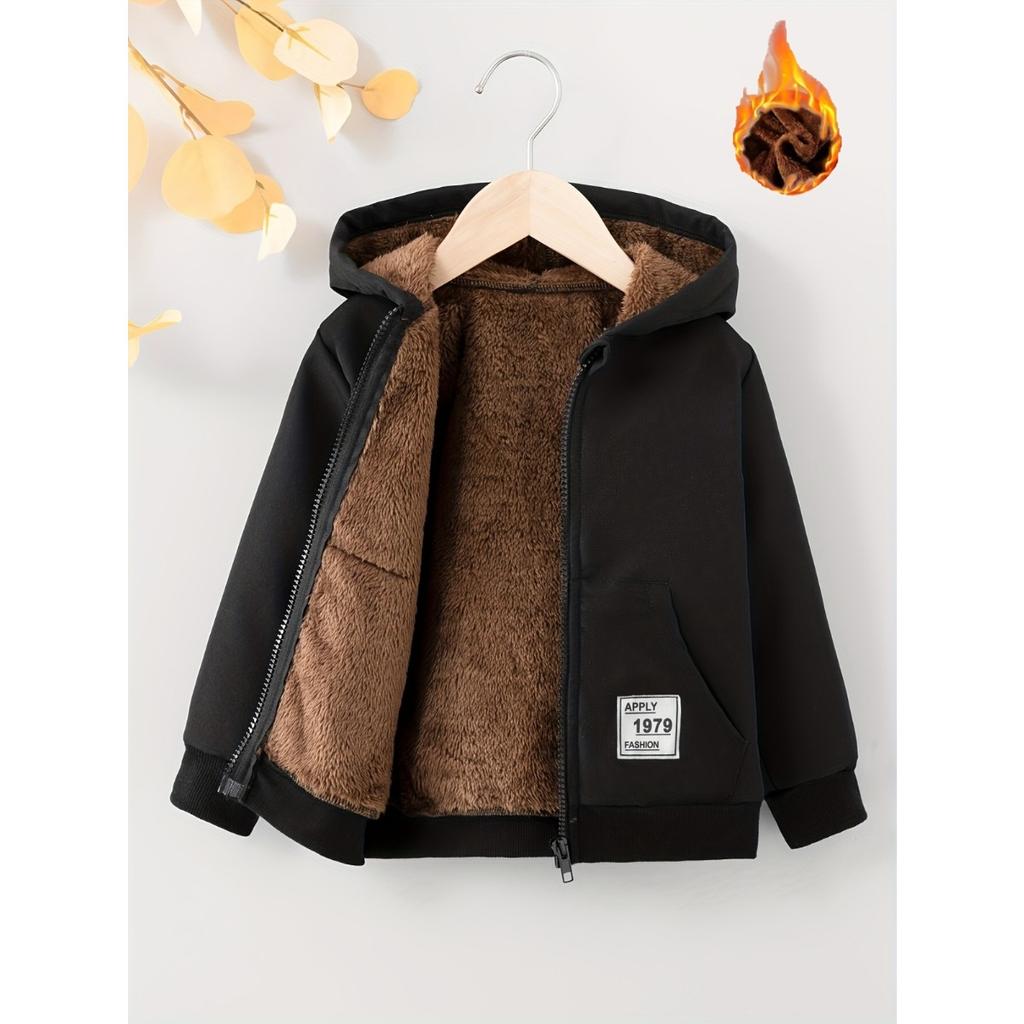 Chłopięca jesienno-zimowa kurtka kompozytowa z kapturem zapinana na zamek, z podszewką polarową