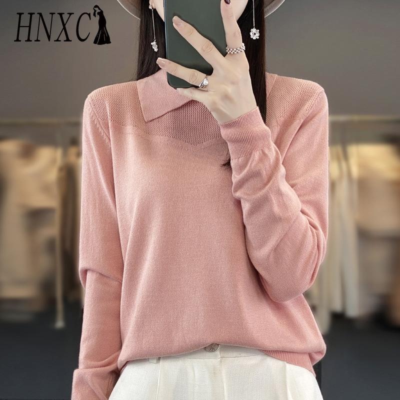 HNXC Jesienny i zimowy sweter dzianinowy, damski sweter z dzianiny w jednolitym kolorze z kołnierzykiem polo i długim rękawem, luźny jednolity dzianinowy podkoszulek