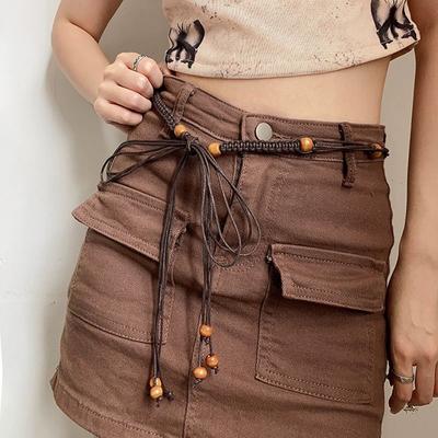 Bohemian Pleciony Bawełniany Sznurkowy Pasek Z Drewnianymi Koralikami Regulowany Podkreślający Talię Cincher Do Sukienek I Spodni Z Wysokim Stanem