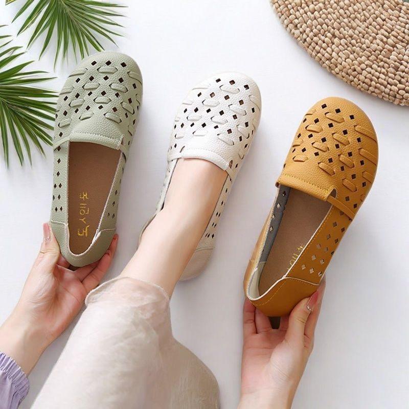 Versatile casual flat-bottomed beef tendon sole Doudou shoes for women 2025 summer new soft-soled soft-faced breathable hollow ladyshoes for women
