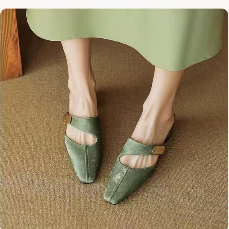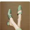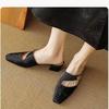 Modne Klapki Damskie 2025 Letnie Buty Pokrowce Szpilki Sukienka Metalowe Wsuwane Mokasyny Kwadratowy Nosek Gruba Obcas Wycinane Buty