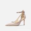 Duży rozmiar 45nitowe buty na wysokim obcasie ze szpilką i szpiczastym noskiem z lakierowanej skóry, nowy styl, temperamentne sandały z prostym paskiem