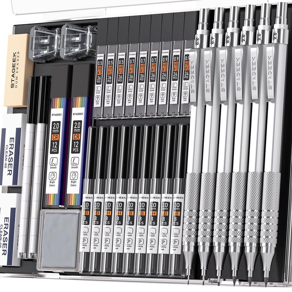 STAGEEK 34-częściowy zestaw metalowych ołówków mechanicznych do rysowania, zawiera 3 ołówki do rysunku technicznego (0,5, 0,7, 0,9 mm) & 3 Ołówki mechaniczne (2 mm), 384 leadów (6B, 4B, 2B, HB, 2H, 4H, Kolorowe), do Pisania, Szkicowania i Rysowania, Srebrny