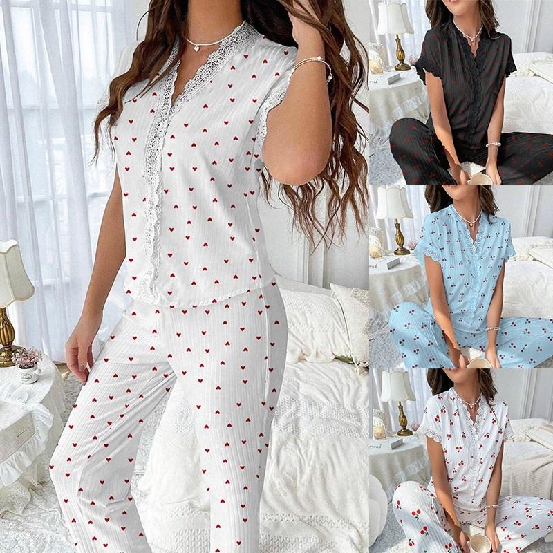 Damski Zestaw Piżamowy z Długim Rękawem w Wiśniowy Wzór Wygodna Odzież do Spania z Kołnierzykiem i Długimi Spodniami Dwuczęściowy Strój Idealny do Noszenia w Domu