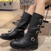 Spice Girl Belt Buckle Pile Boots Women's Leather But Knee Boots High Boots Brown Big Tubular Rider Boots