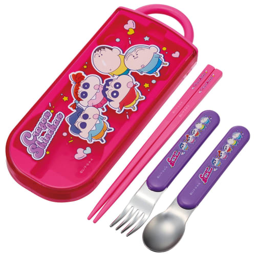 Skater Kids' Bento Trio Set, Chopsticks, Spoon, and Fork, Antibacterial Cutlery, Easy-Open Slide-Open Design, Made in Japan, Crayon Shin-chan Design,