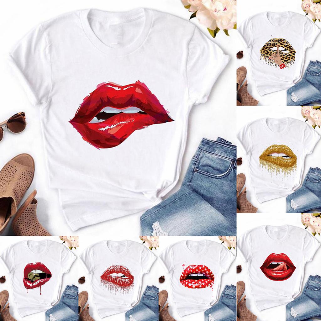 Modna damska bluzka z krótkim rękawem i nadrukiem w czerwone usta