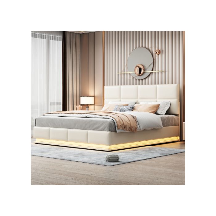 Lit - MUVOE - 180x200 cm - Éclairage LED - Rangement hydraulique - Beige