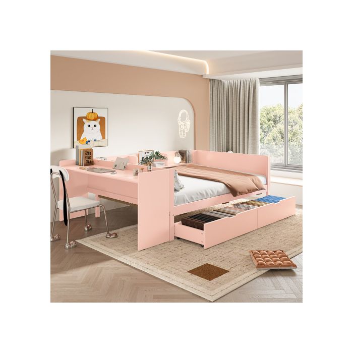 Lit double en bois - MUVOE - 140x200 cm - avec bureau - 2 tiroirs - couleur rose