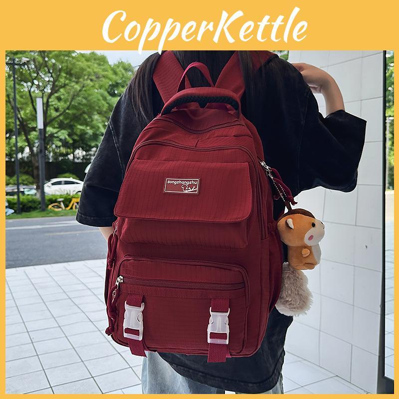 Color Solid Simple Checkered Texture Student Backpack With Plush Pendant