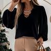 Ta stylowa damska koszula z dekoltem w serek w dużym rozmiarze łączy europejską i amerykańską wrażliwość modową dzięki eleganckiemu łańcuszkowemu dekoltowi.. Wykonany w całości z poliestru, zapewnia wygodę i trwałość. Koszula ma jednolity wzór i długie rękawy, stanowiąc wszechstronny dodatek do każdej garderoby.. Jego luźny krój sprawia, że jest to korzystny wybór dla różnych typów sylwetki, a charakterystyczny dekolt w serek dodaje odrobinę wyrafinowania zarówno Twoim strojom casualowym, jak i formalnym.