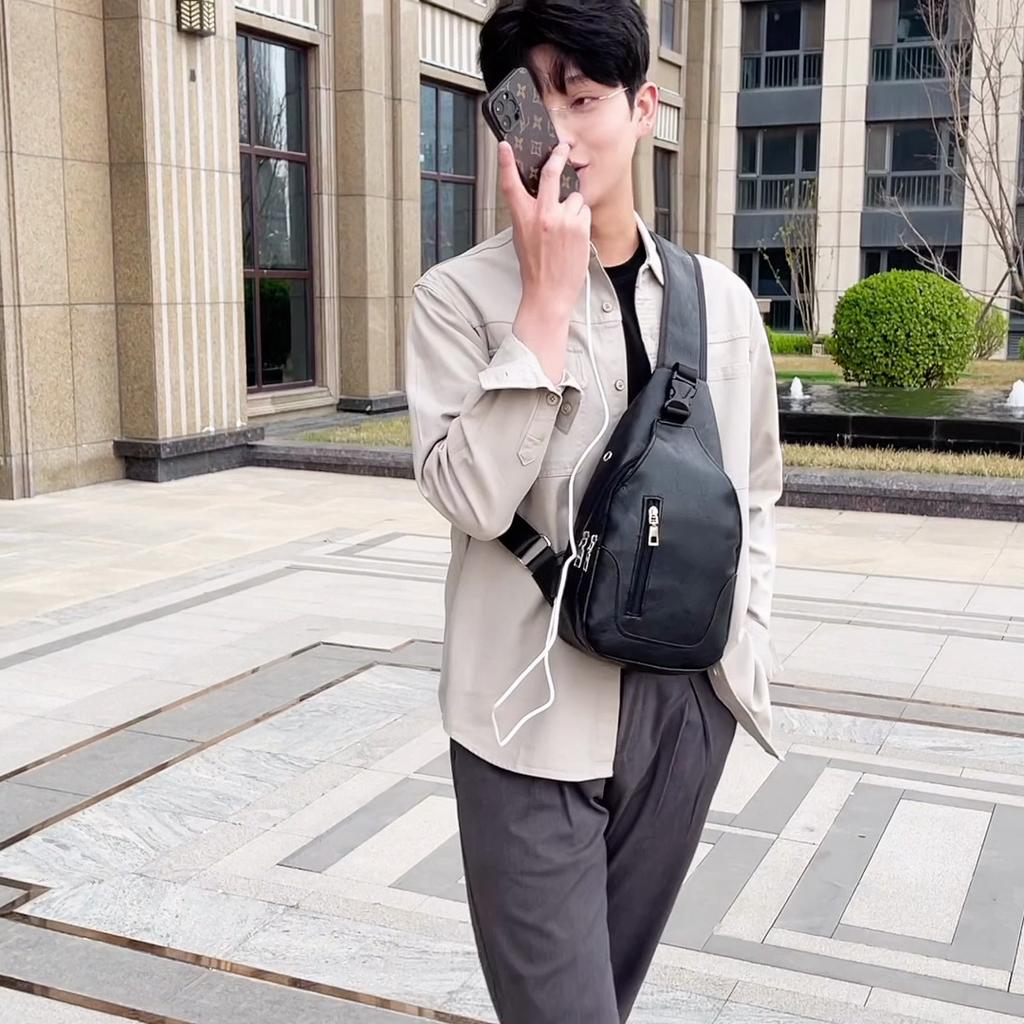 Simple and Fashionable Casual Solid Color PU Multifunctional USB Charging Zipper Man's Chest Bag Crossbody Bag for Commuting