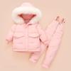 Zestaw dziecięcych kurtek puchowych z dwuczęściowymi szelkami i futrzanym kołnierzem zapewniającym ciepło