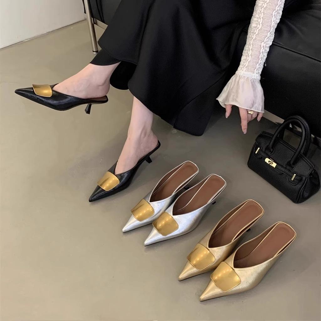 Summer new metal buckle pointed heel thin heel bag head slippers women wear cool slippers half slippers