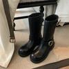 Cowhide version grape mother same retro metal buckle western cowboy boots round head black locomotive boots women's pile short boots