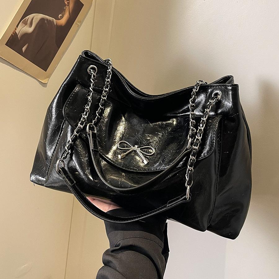 - **Structured Design Details**: Features a stylish handbag silhouette with PU material, glossy finish, chain strap, and a cute bow accent. It supports versatile carrying options (handheld, shoulder, crossbody) with an adjustable chain strap. It exudes glamorous and chic charm. Four vibrant color options cater to diverse style preferences.