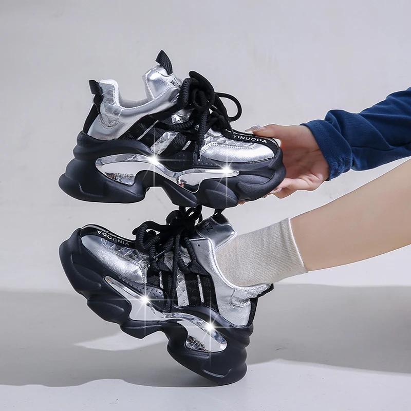 Fashion 8.5CM Autumn Chunky Sneakers for Women 2025 High Platform Sports Patchwork Leather Shoes Woman Lace-up Thick Bottom Dad Shoes