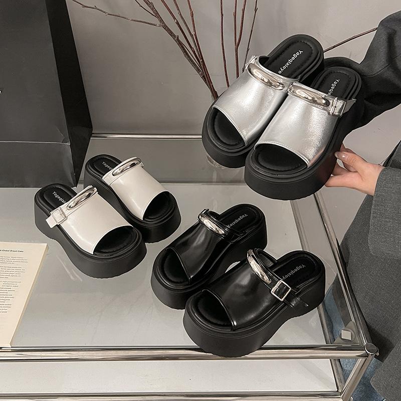 Small thick-bottomed cool slippers for women's outer wear 2025 summer new high-end metal buckle light bottom high-heeled sandals for women