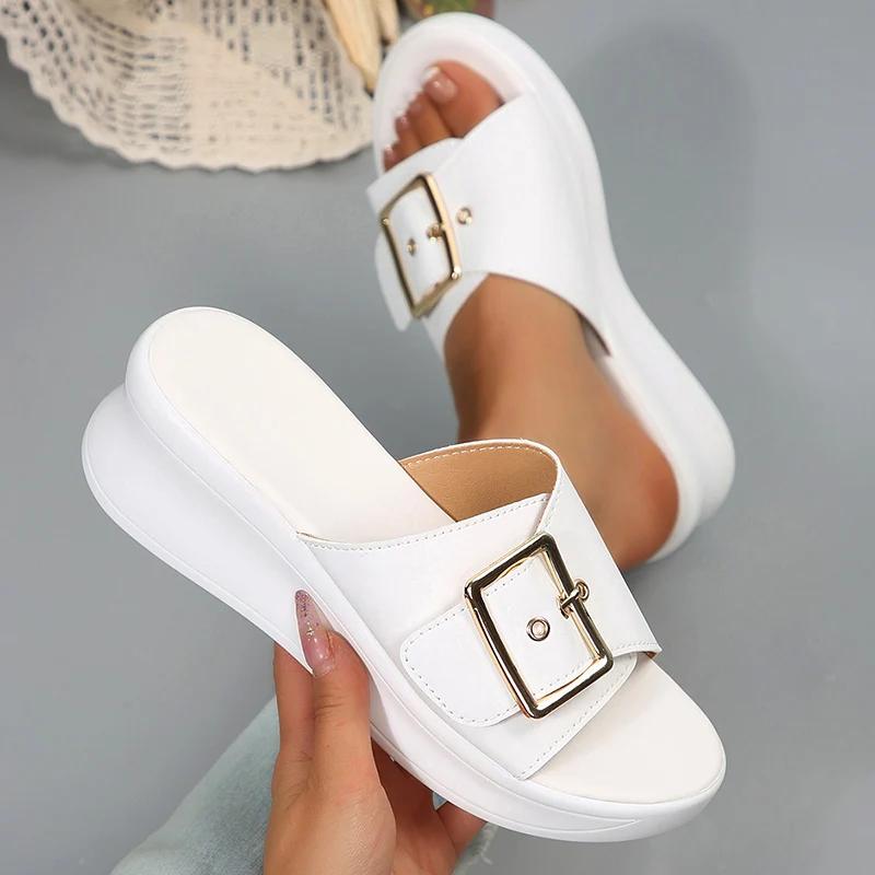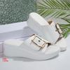 Modne Damskie Sandały Metalowa Klamra Koturn Sandały Damskie Lato 2025 Skóra Gruba Podeszwa Klapki Damskie Lekkie Sandały Plażowe Na Wysokim Obcasie