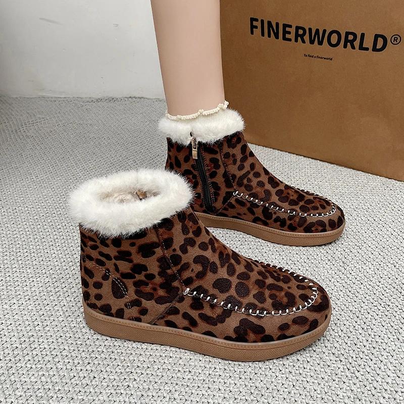 Moda Damskie Modne Płaskie Bawełniane Kozaki Zimowe Nowe Okrągły Nosek Panterka Zamszowy Boczne Zapięcie na Zamek Antypoślizgowe Krótkie Kozaki