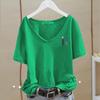 Poczuj swobodny styl i komfort dzięki naszej damskiej koszulce z dekoltem V, krótkim rękawem, wykonanej z bawełny bambusowej.. Wykonana z wysokiej jakości mieszanki bambusa i bawełny, ta koszulka zapewnia miękkie, oddychające uczucie, idealne na letnie dni.. Modny koreański styl charakteryzuje korzystny dekolt w serek i swobodna biała baza, co czyni go wszechstronnym dodatkiem do każdej garderoby.. Idealna zarówno na nieformalne wyjścia, jak i do swobodnego noszenia w domu, ta koszulka łączy elegancję i wygodę w jednym stylowym elemencie.