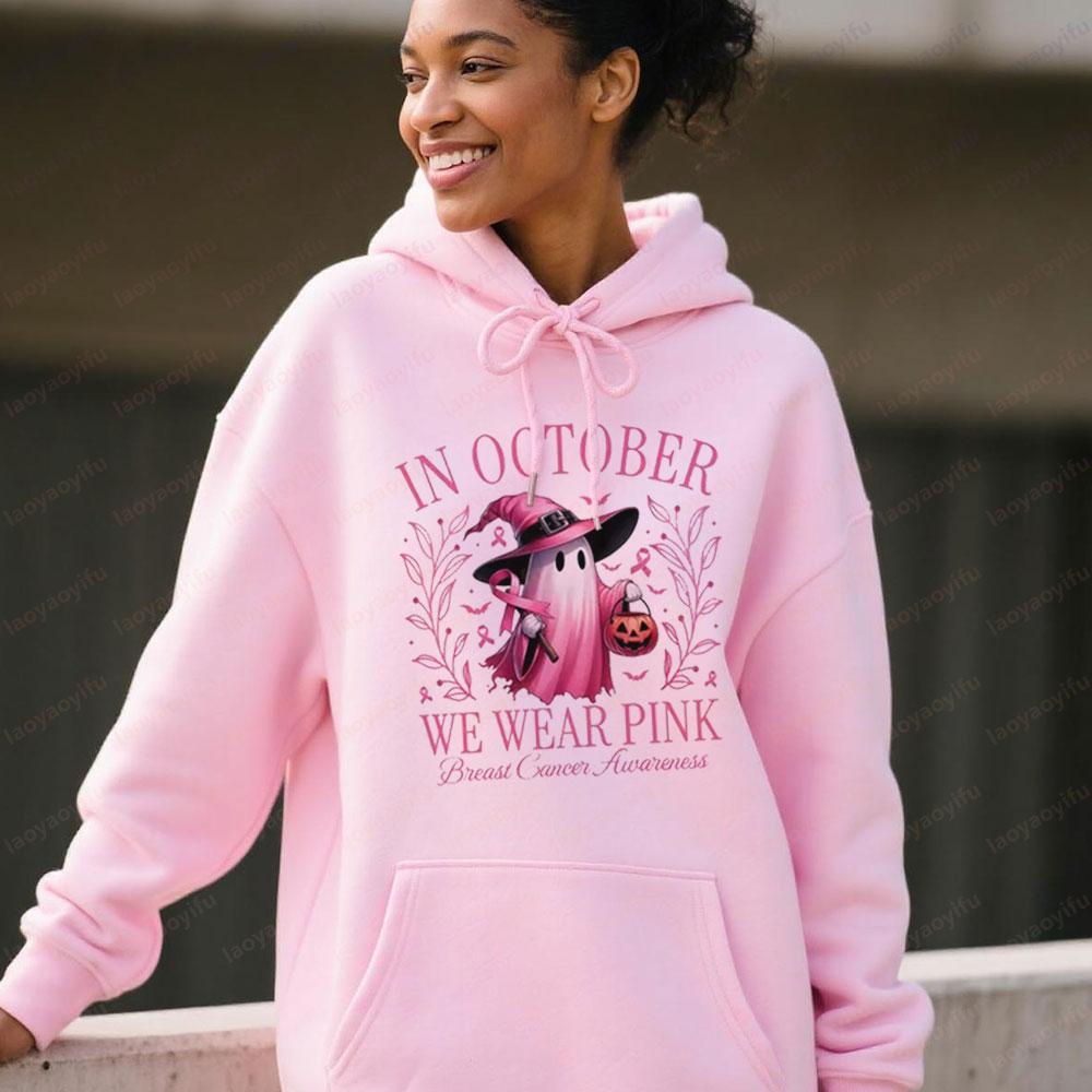 In October We Wear Pink Ghost Sweatshirt Breast Cancer Awareness Clothing Nobody Fights Alone Motivational Women Sweatshirts