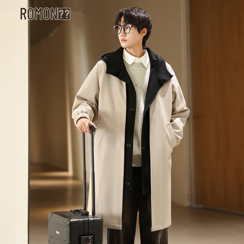 ROMON Men's Thickened Hooded Faux Two-Piece Mid-Length Trench Coat
