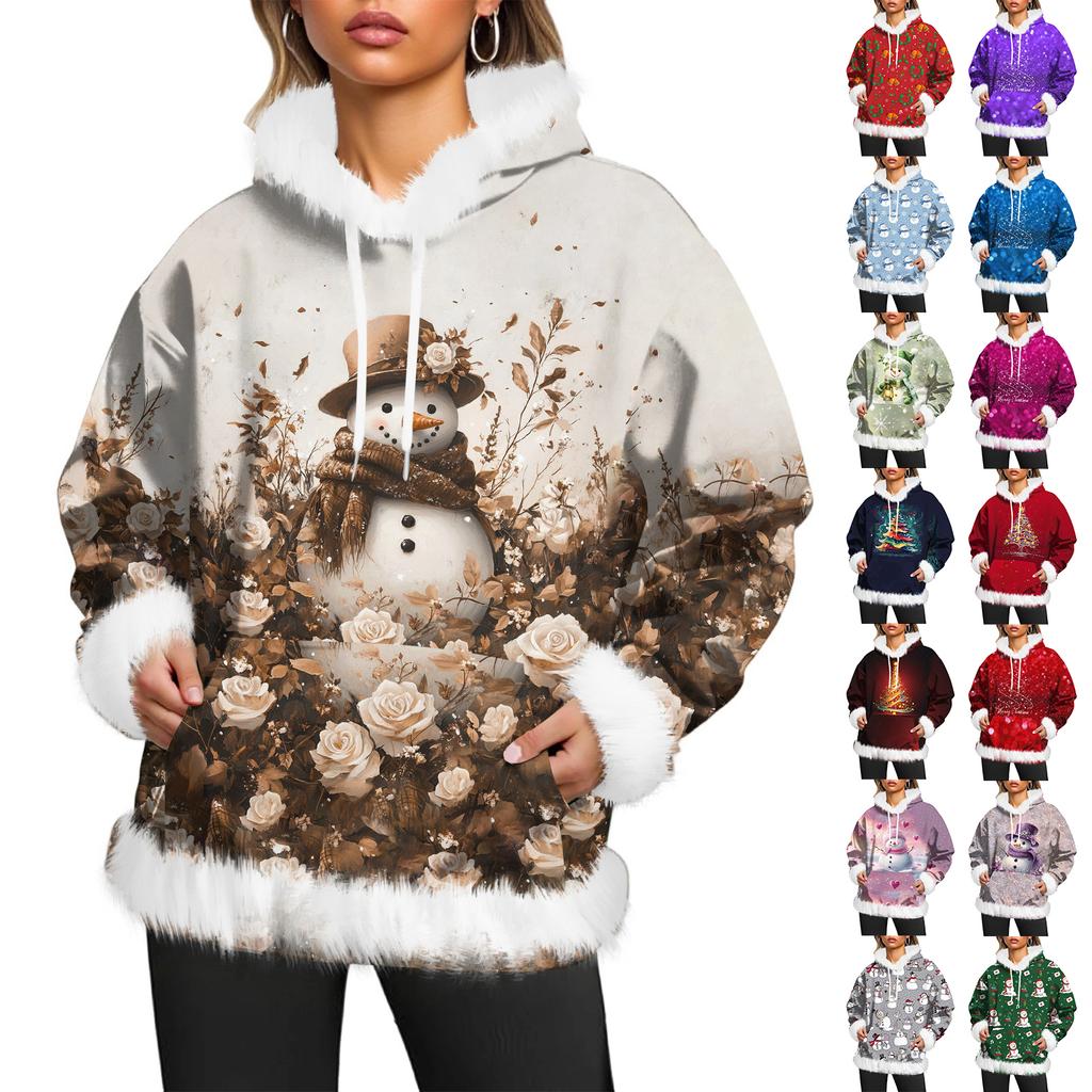 Damska świąteczna bluza z kapturem, casualowa, z podszewką z polaru, z długimi rękawami i kieszeniami