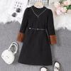 Odzież Dziecięca Nowa Jesień Zima Dziewczęca Patchworkowa Pluszowa Sukienka z Paskiem