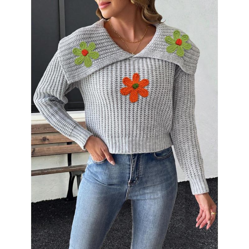 Top Women's Lapel Embroidered Flower Patchwork Pullover Sweater for Women