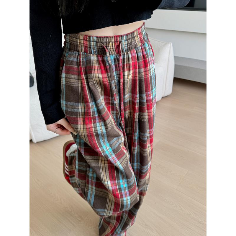 Retro Czerwone Spodnie w Kratę Damskie na Wiosnę i Jesień Nowe Luźne Spodnie z Szerokimi Nogawkami Wysoki Stan Casualowe FloorFashion
