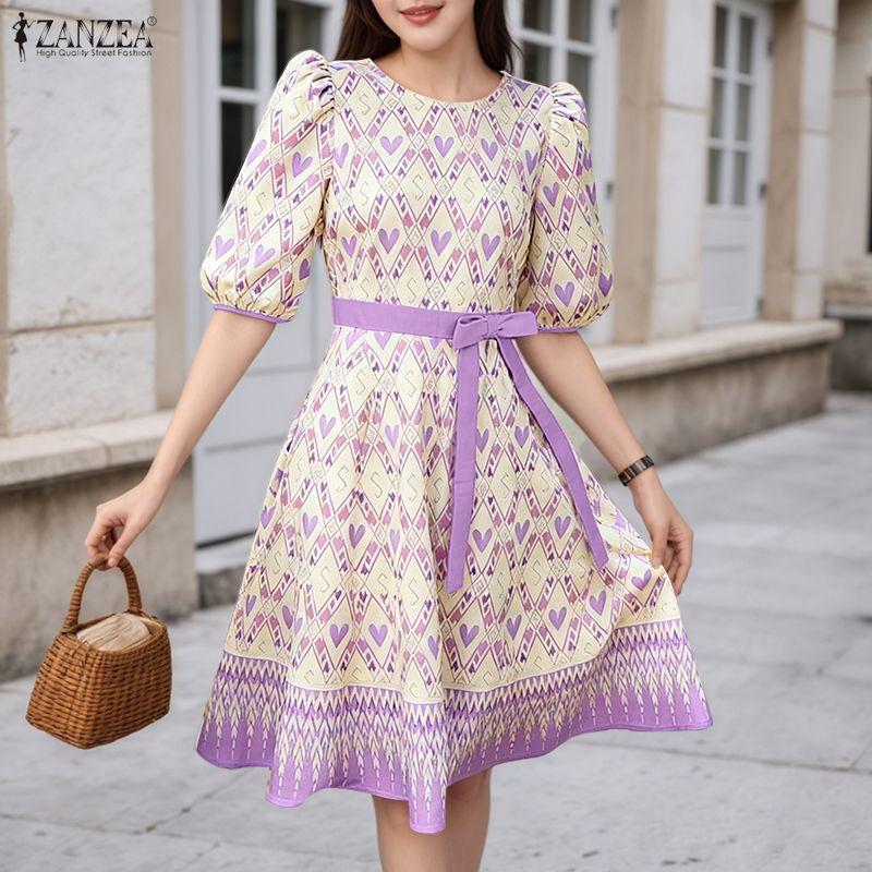 ZANZEA Damska codzienna sukienka letnia z okrągłym dekoltem i krótkim rękawem z nadrukiem
