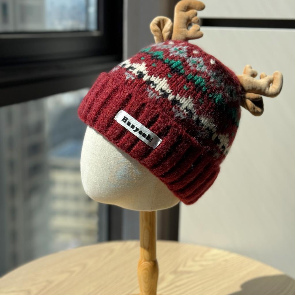 New Cute Christmas Red Antler Knitted Hat for Women in Autumn and Winter Thickened Fashionable Warm Plush Ear Protection Woolen Hat
