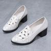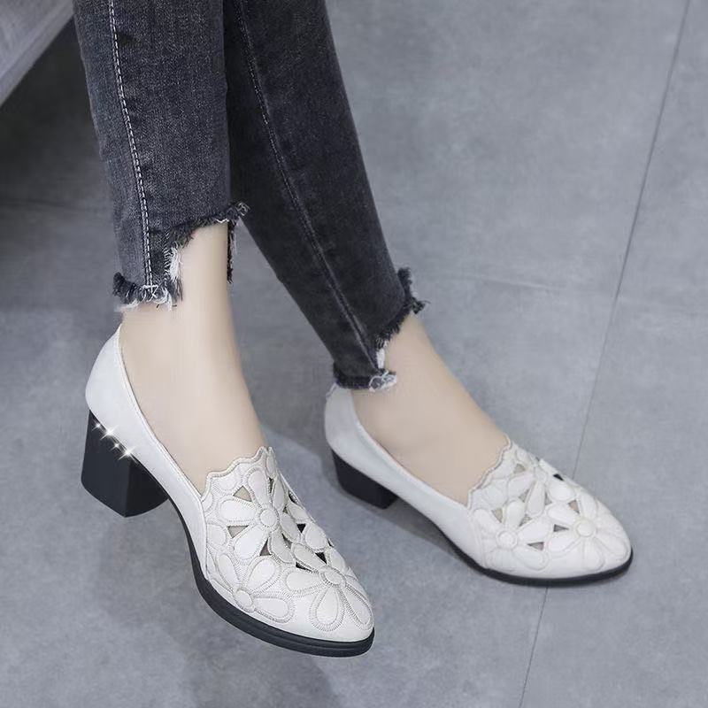 Soft leather soft sole low-top single shoes women's flat bottom 2025 summer new thick heel pointed hollow flower work leather shoes women
