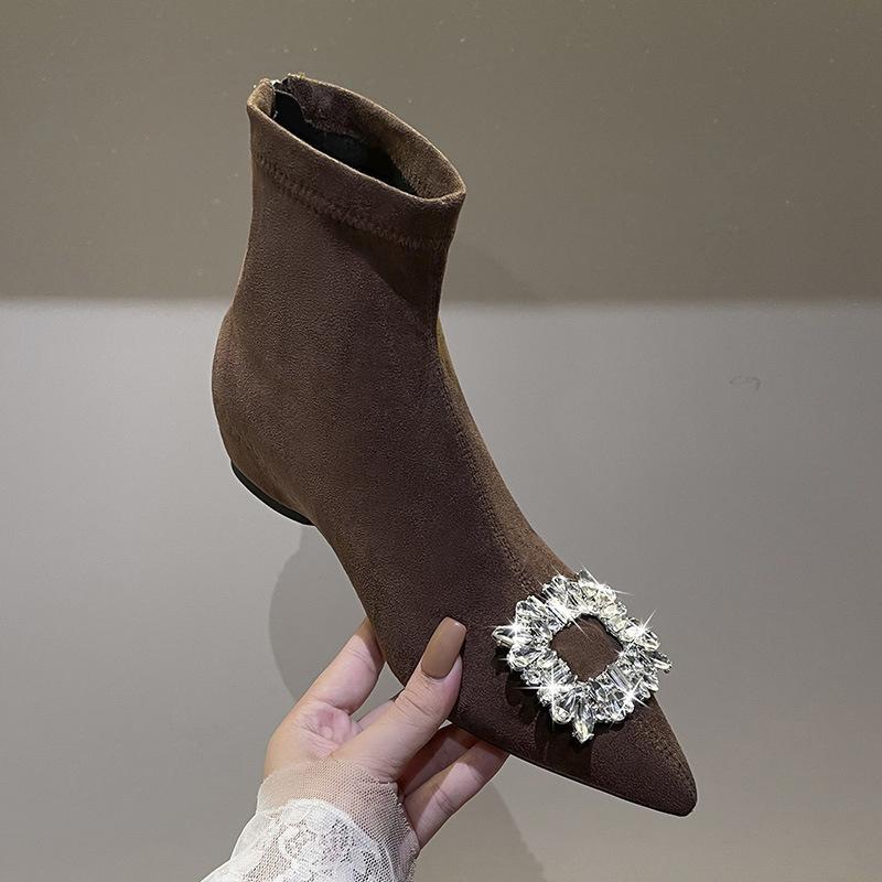Inner heightening short boots women's spring and autumn single boots French pointed rhinestone square buckle suede versatile rear zipper short thin