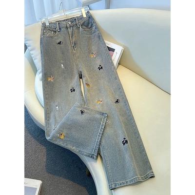 Wygodne Zabawne Haftowane Szczenię Szerokie Spodnie Jeansowe Damskie Wiosna i Jesień Design Czucie Słodkie Wysoki Stan Luźne Skinny Proste Spodnie Długie Spodnie Jeansowe