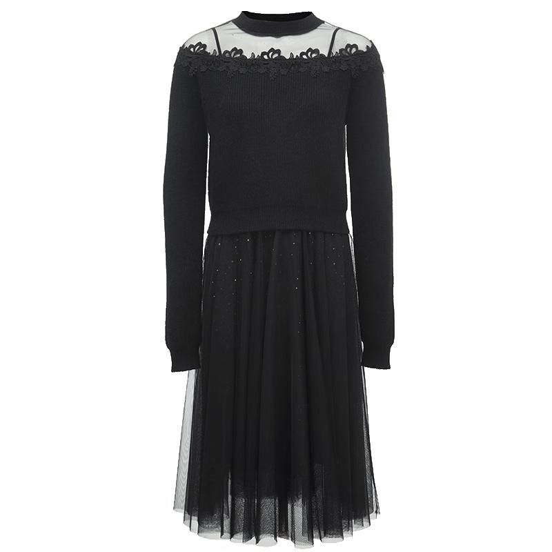 Veromoda Damska dzianinowa sukienka swetrowa z okrągłym dekoltem, z siateczkowymi wstawkami patchworkowymi