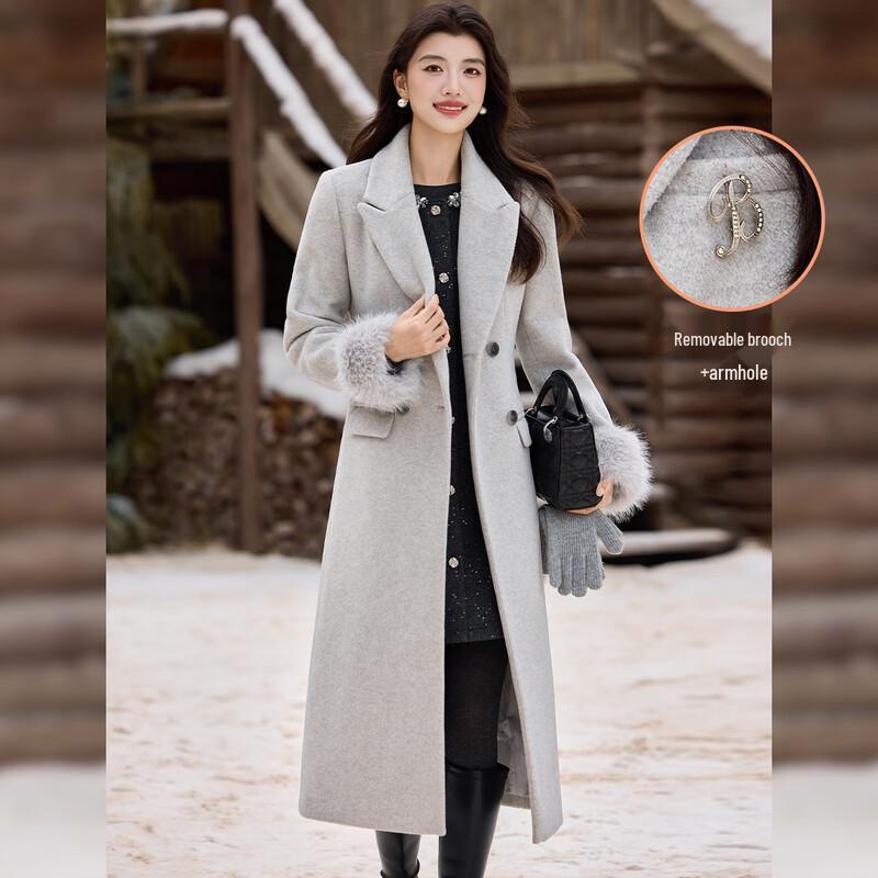 Bailuyu Women's Elegant Slim Fit Double-Breasted Long Wool Coat