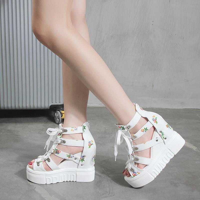 Sandały damskie na wiosnę i lato, na grubej podeszwie, na koturnie, z nadrukiem, z wycięciem typu rybi pysk, z zamkiem z tyłu, sznurowane, wysokie, antypoślizgowe, z miękką podeszwą, buty damskie