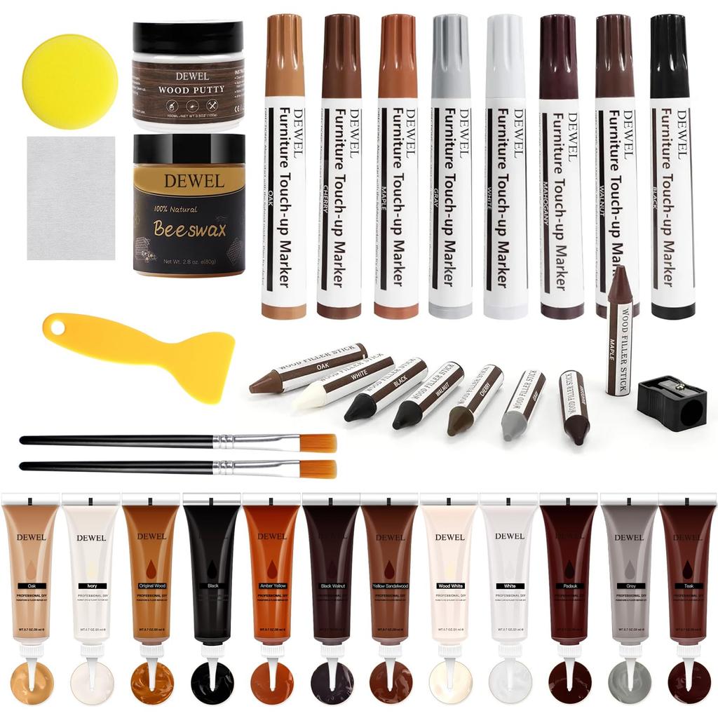 👍【Zawartość opakowania】12 kolorów kremu naprawczego, 8 pisaków naprawczych, 8 kredek, 100g szpachli do drewna, 1 wosk pszczeli, 1 temperówka, 1 gąbka, 1 papier ścierny, 1 skrobak i 2 pędzle.