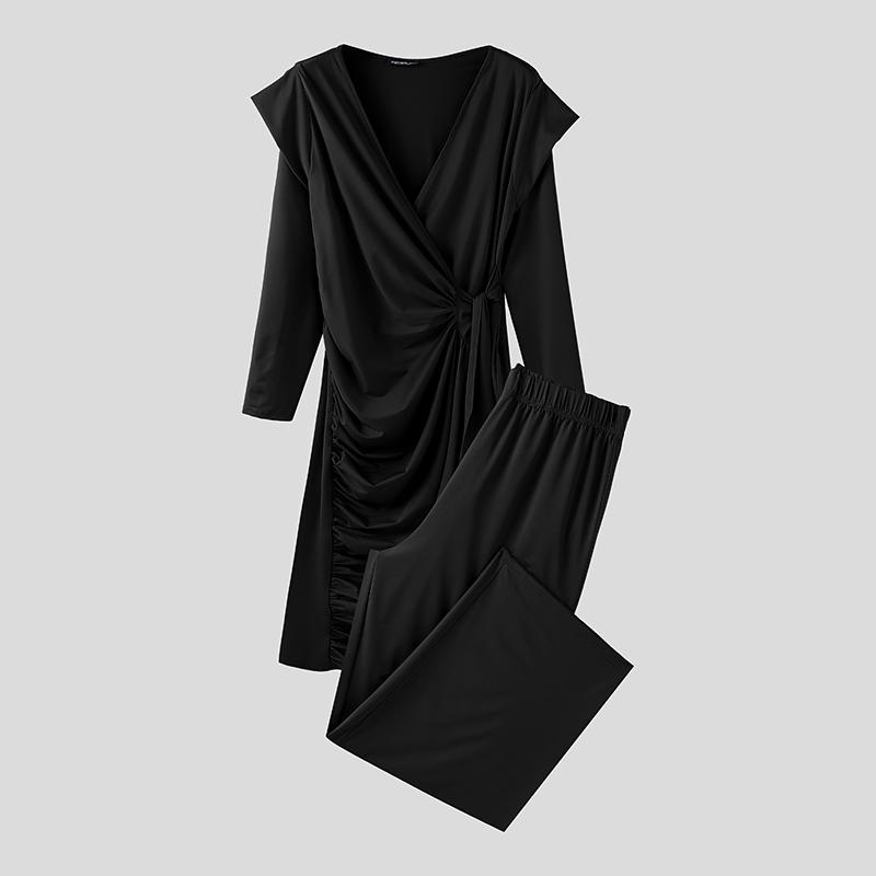 INCERUN 2 SZTUKI Męskie Koszulki z Dekoltem V i Długim Rękawem Falbankowe Skręcone Zestawy Ubrań Domowych Spodnie