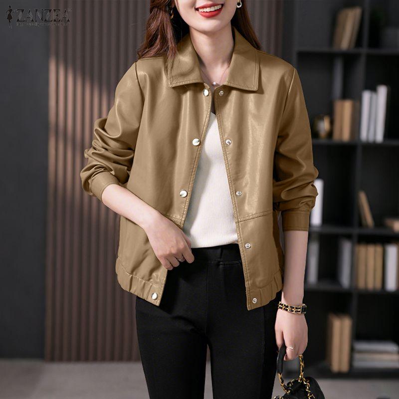 ZANZEA Damska codzienna jesienna kurtka z długim rękawem ze sztucznej skóry PU