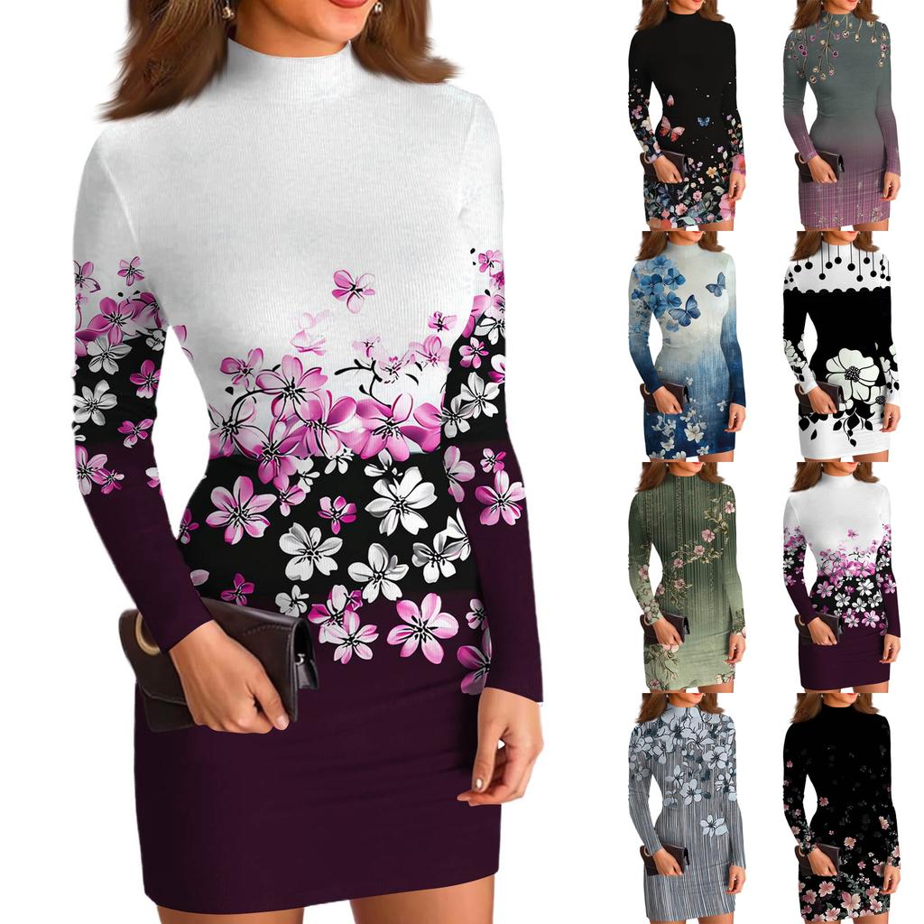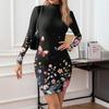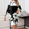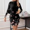 Damska sukienka codzienna z wysokim dekoltem, z długim rękawem, z nadrukiem, dopasowana
