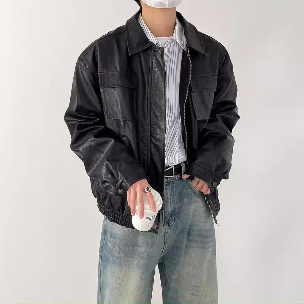 Autumn and Winter Korean Style Retro PU Motorcycle Style Leather Jacket Men's Loose Lapel Jacket